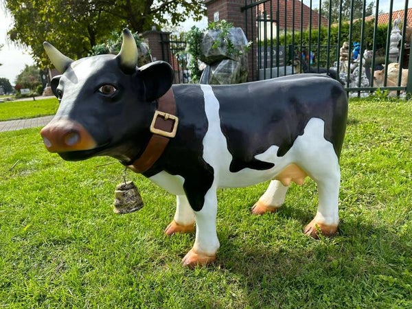 Leuke koe van polystone. Beeld is 65 cm hoog en 95 cm lang. Is in orginele kleur en de beroemde paarse kleur leverbaar. Wordt geleverd inclusief bel.