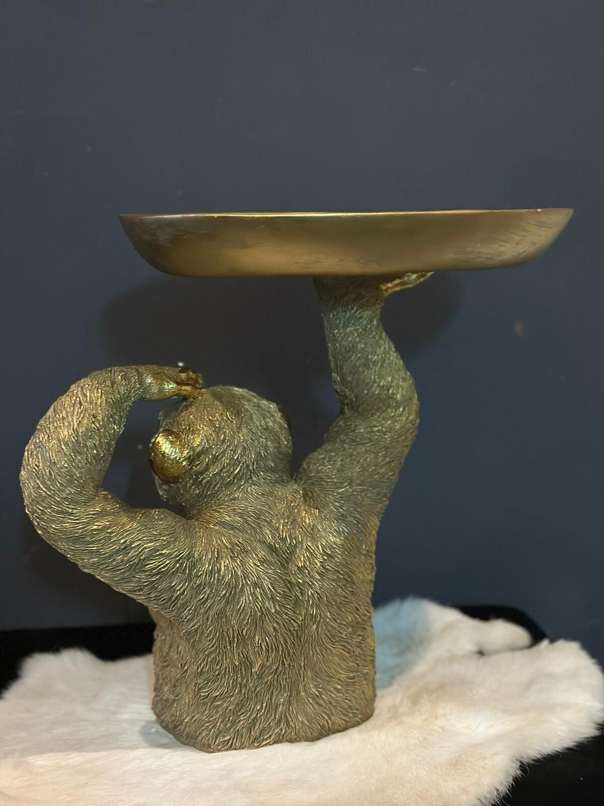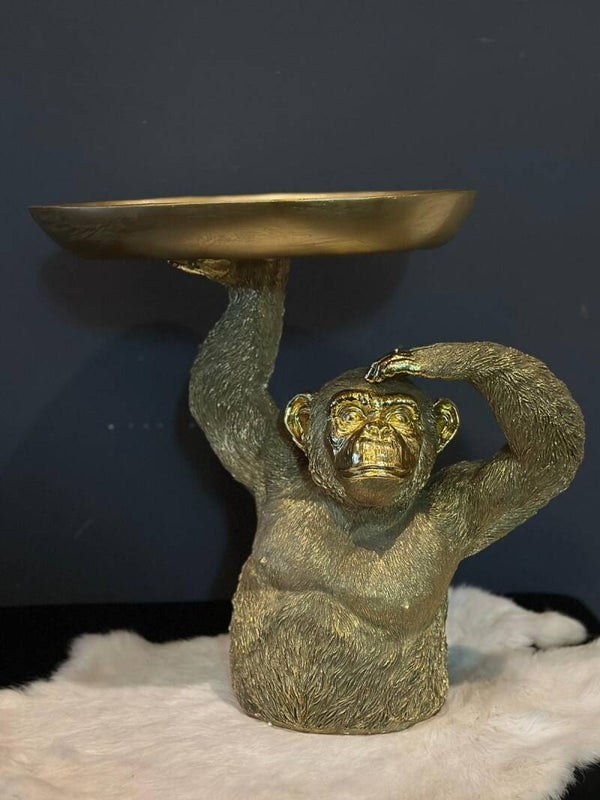 Deze Chimpansee heeft een dienblad boven zijn hoofd. Leuk voor je sleutels of iets dergelijks op te leggen. Super mooi en stevig beeld.