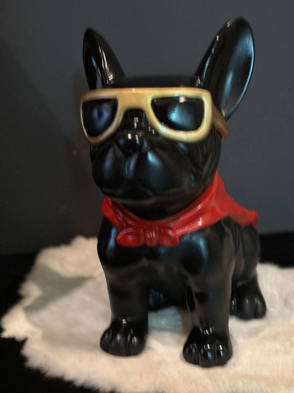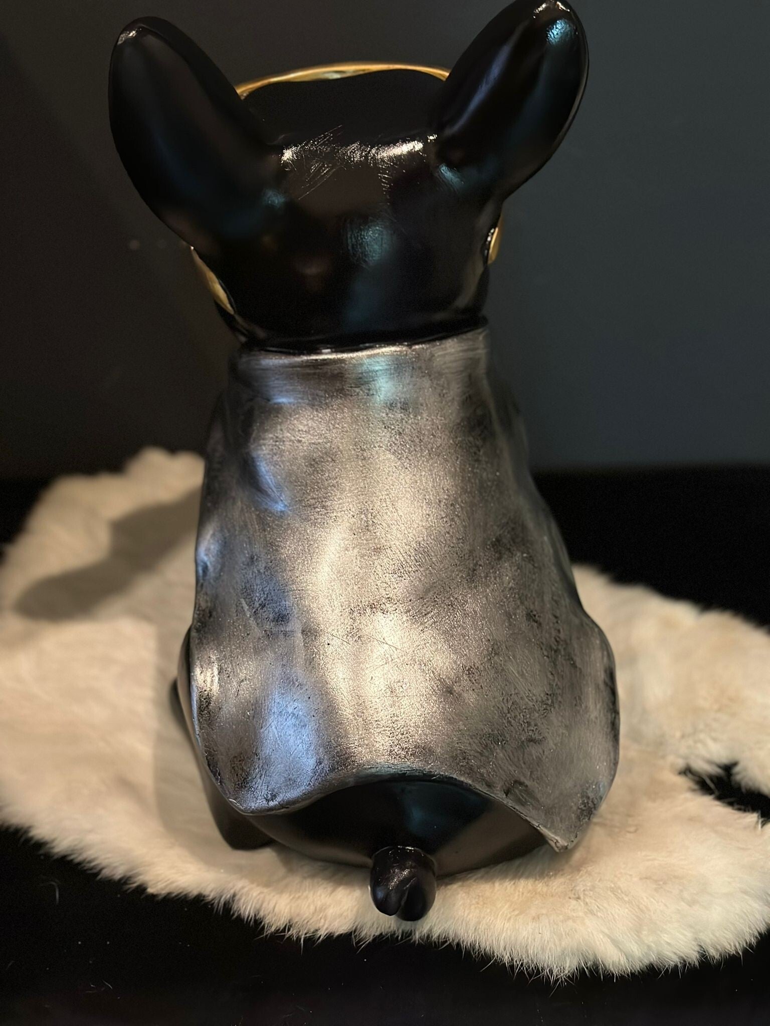 Een echte superhond deze Franse Bulldog. Compleet met cape (diverse kleuren). Super leuke uitvoering van een zittende Franse Bulldog. Deze 35cm hoge held is beslist een aanwinst voor uw interieur.
