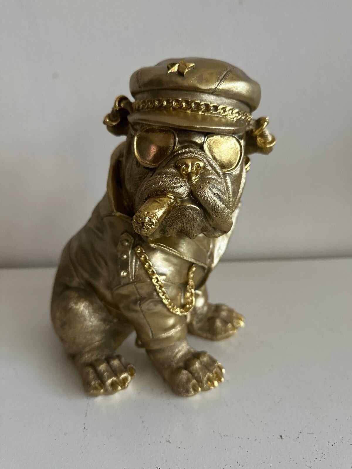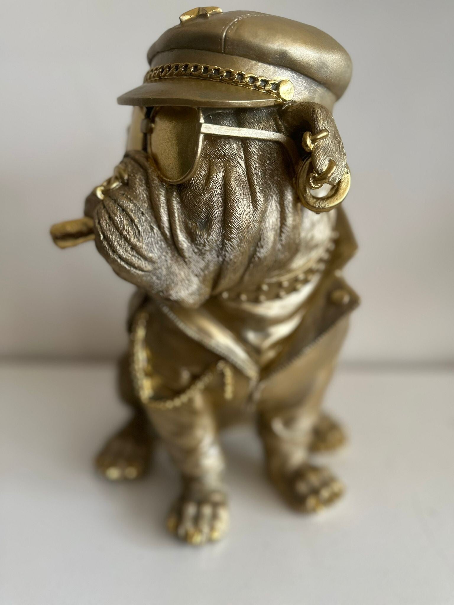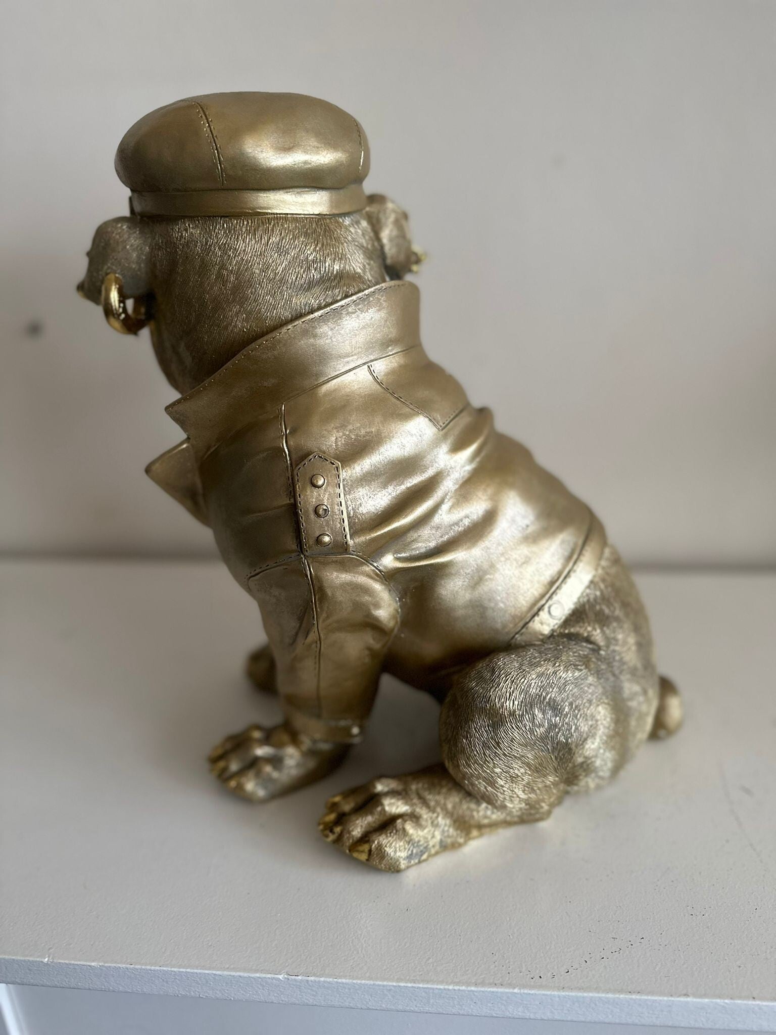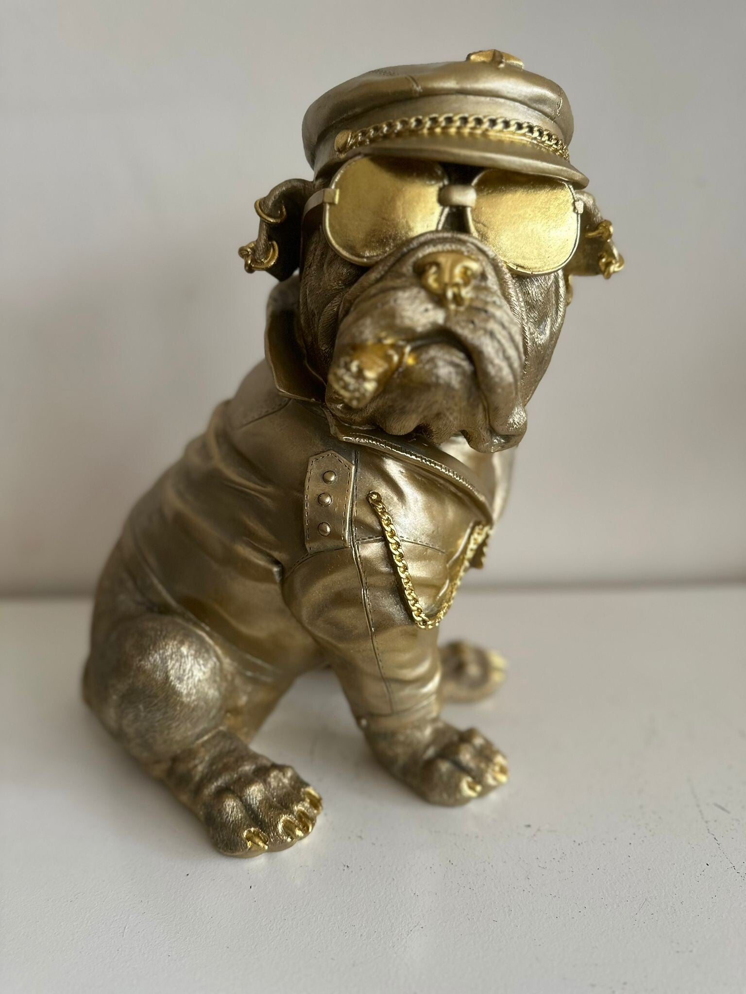 Deze stoere Biker mag niet ontbreken in uw mancave of interieur. Super leuke Engelse Bulldog in biker uitvoering. Beeld is 35cm hoog.