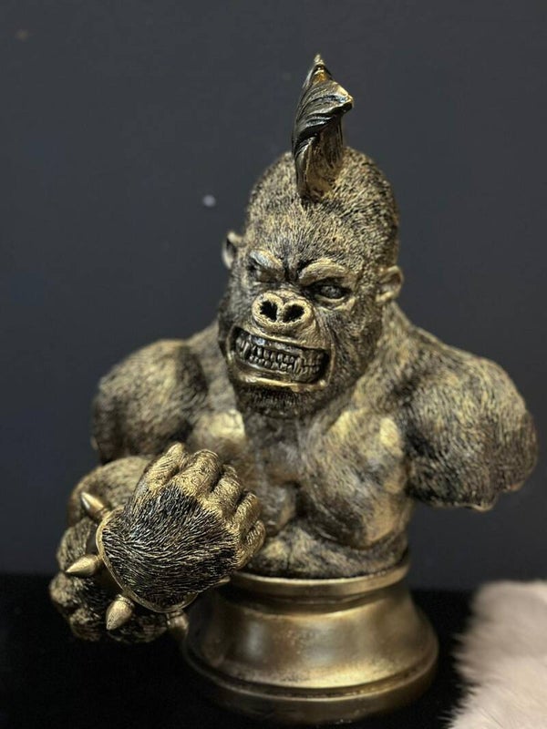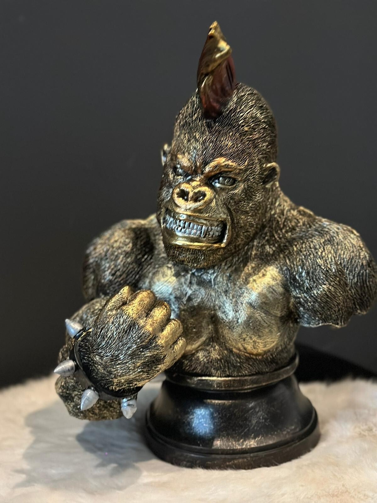 Zeer boos kijkende Gorilla met hanekam. Je zou er bang van worden. Gelukkig is dit een aardig die alleen maar boos kijkt. Prachtig beeldje voor in de mancave of junglekamer. Beeld is 30cm hoog en 21cm breed.