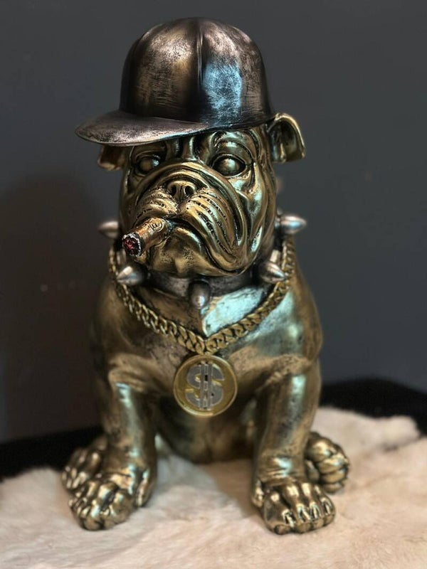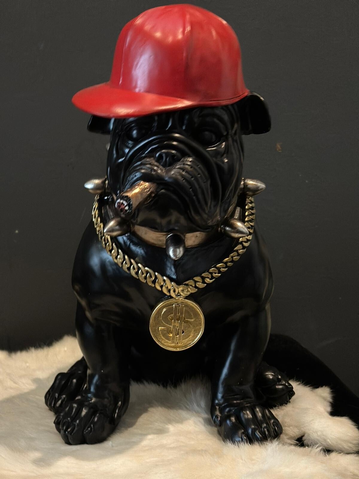 Schitterende Engelse Bulldog in street look. Compleet met cap, kettingen en ringen. Heeft ook nog eens de perfecte kleur brons of zwart. Beslsit een blikvanger met een glimlach. Gewoon een Coole Bulldog. Afmeting