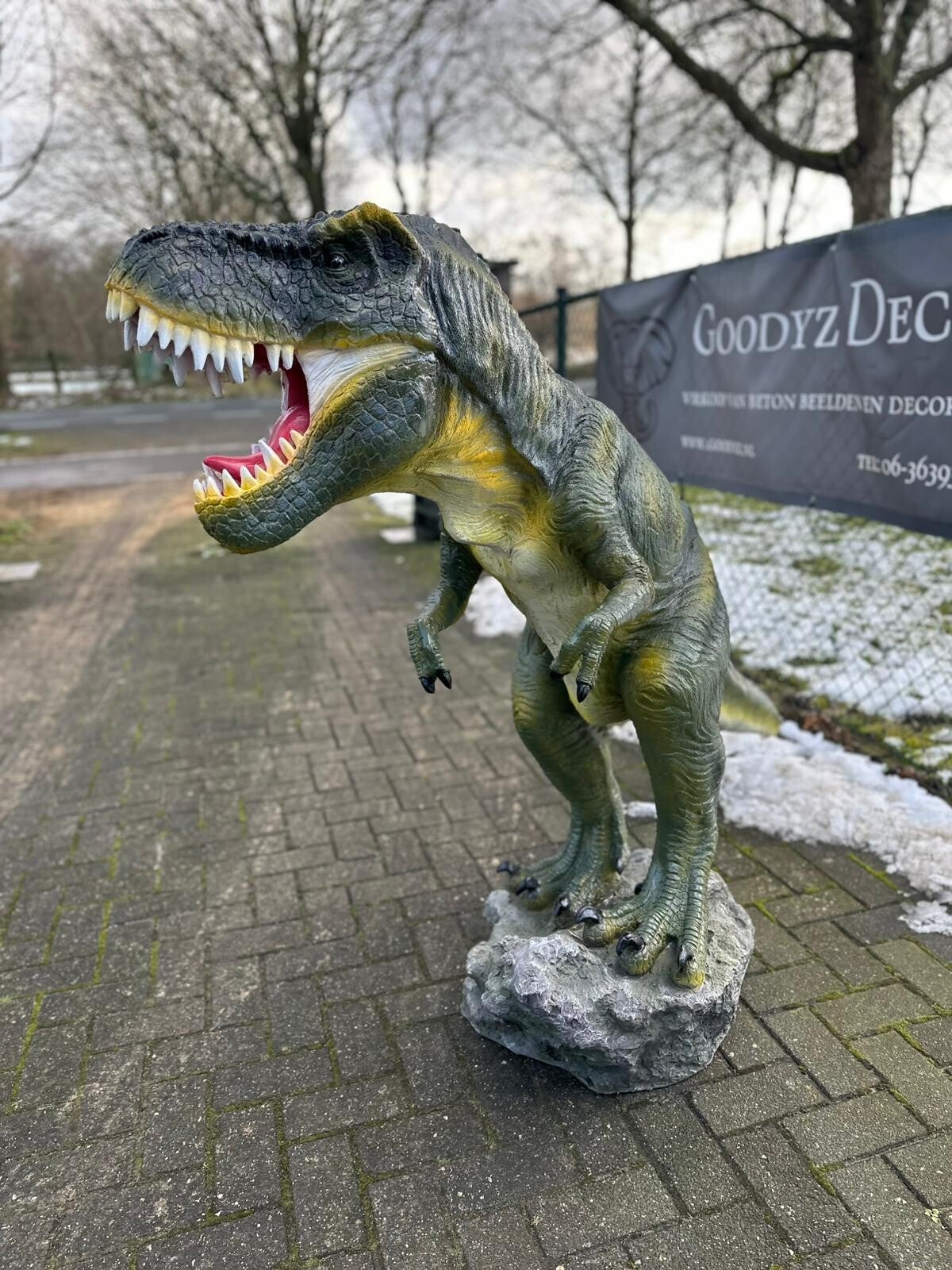 Het beeld is gemaakt van hoogwaardig polyresin en is zorgvuldig afgewerkt om zowel realisme als een moderne uitstraling te combineren. Van de scherp gevormde tanden tot de gespierde staart, elk detail is met precisie ontworpen om het onmiskenbare karakter van de T-Rex vast te leggen.