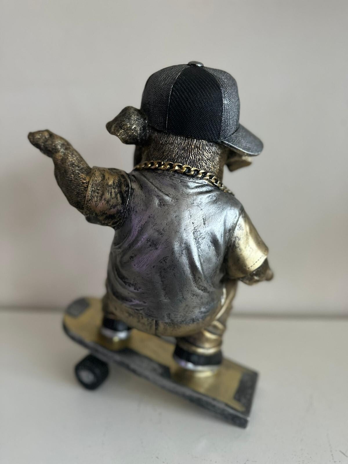 Dit unieke kunstwerk toont een Engelse buldog in een dynamische houding op een skateboard — een speelse en verrassende combinatie van kracht, humor en beweging. De stevige bouw van de buldog contrasteert prachtig met de vloeiende lijnen van het skateboard, waardoor het beeld zowel stoer als charmant oogt.