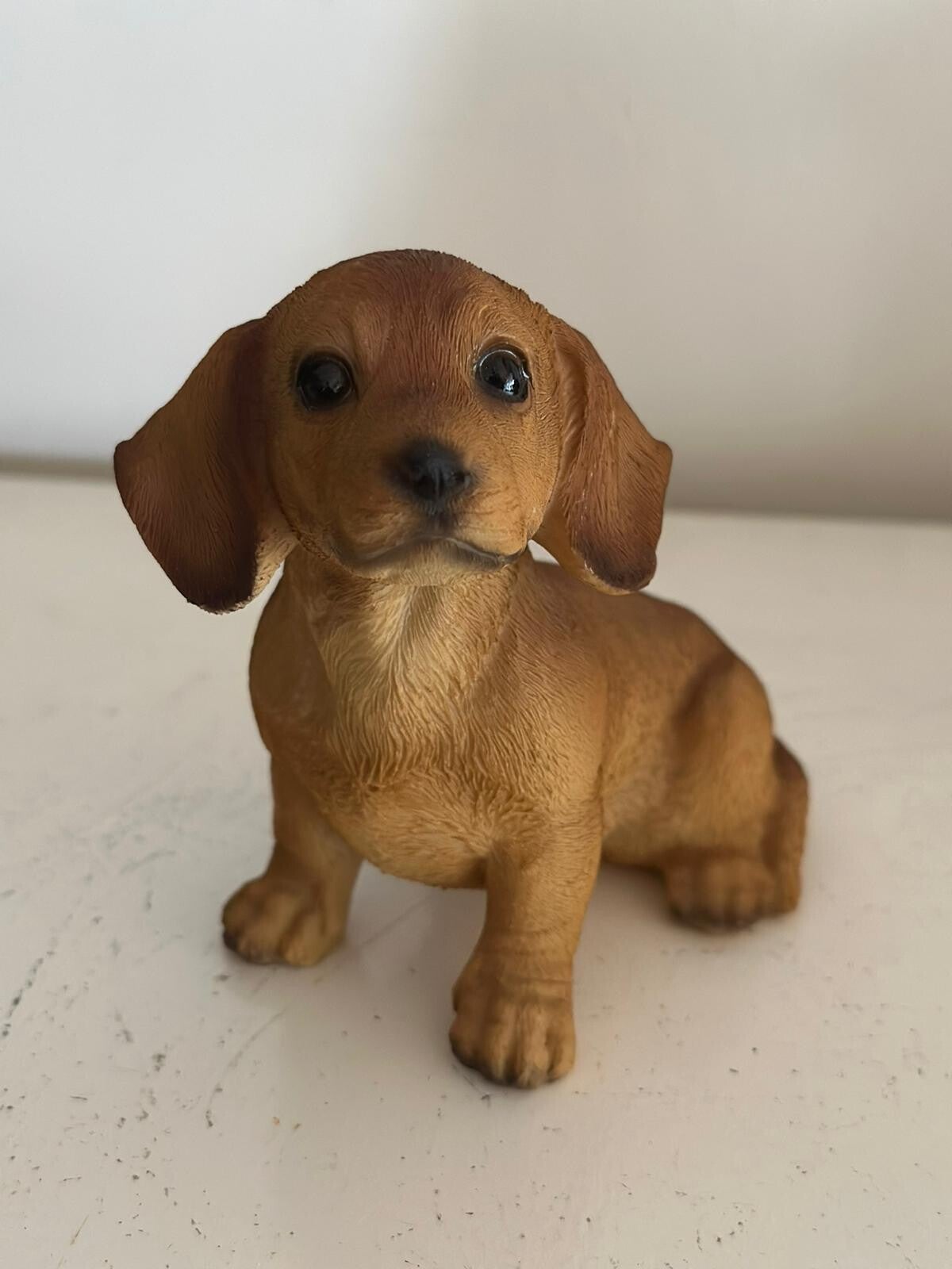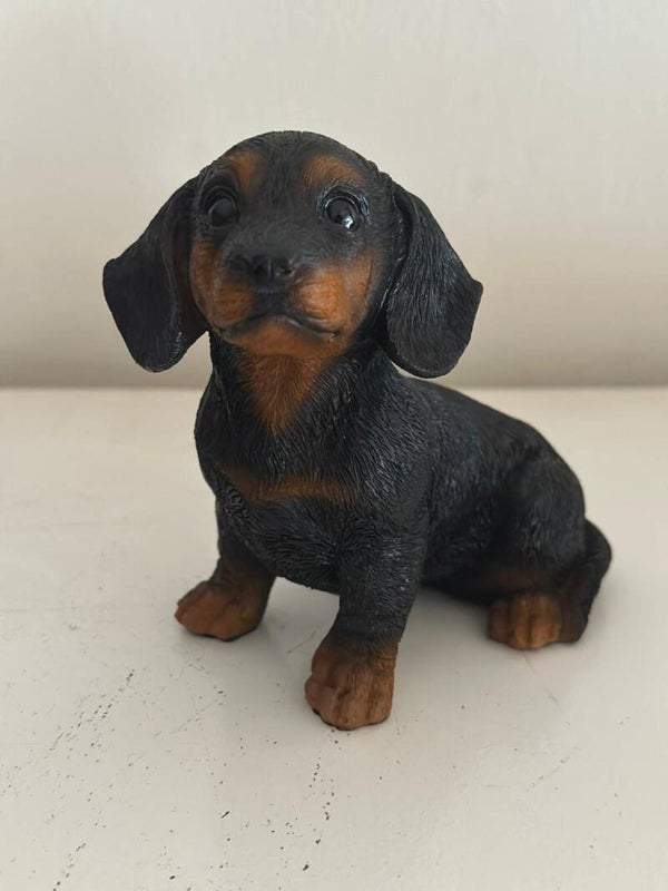 Decoratief beeldje van een zittende teckel, vervaardigd uit hoogwaardig polystone. Het beeldje is gedetailleerd afgewerkt en verkrijgbaar in een realistische bruine of zwarte kleur. Met een hoogte van 11 of 20 cm is het een charmante blikvanger voor in huis of in de tuin. Ideaal voor hondenliefhebbers of als origineel cadeau.