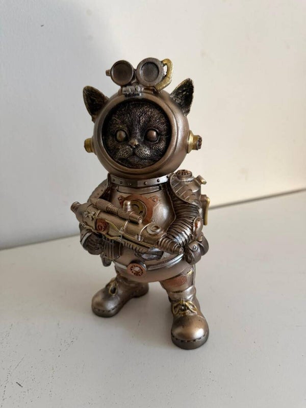 Deze steampunk kat in een ruimtepak is een uniek en speels kunstobject dat meteen de fantasie prikkelt. Met een hoogte van 24 cm combineert dit beeldje humor, creativiteit en industriële esthetiek in één opvallend ontwerp. De kat draagt een gedetailleerd astronautenpak vol steampunk-elementen: tandwielen, metalen verbindingen, buisjes en robuuste mechanische onderdelen.