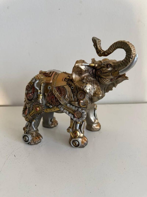Het ontwerp combineert de vriendelijke uitstraling van een olifant met klassieke steampunk-elementen: tandwielen, metalen platen, buisjes en subtiele mechanische accenten. De fijne afwerking en het karaktervolle ontwerp maken dit beeldje perfect voor op een bureau, wandplank, vitrinekast of als cadeau voor liefhebbers van unieke decoratie.