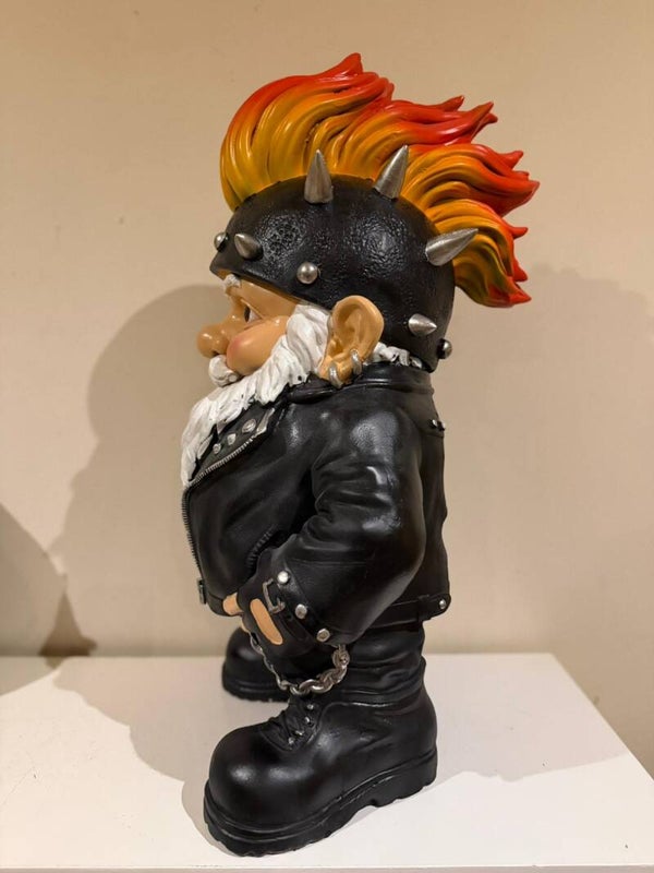 Deze kabouter in stoere bikerlook valt direct op door zijn rebelse uitstraling en opvallende hanenkam. Zijn leren motorjack, zwarte broek en stevige laarzen geven hem een echt ‘ruig’ karakter, terwijl zijn expressieve ogen nog meer persoonlijkheid en charme toevoegen.